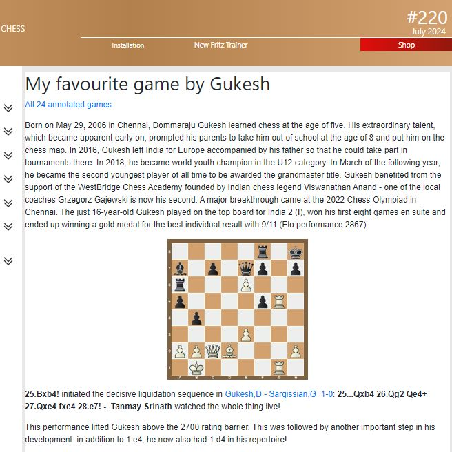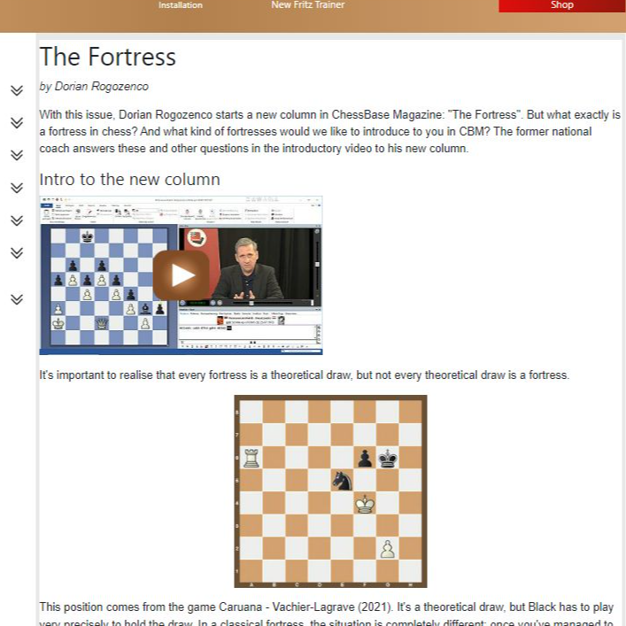 Over 6 hours of video game time with Luis Engel, Rainer Knaak, Rustam Kasimdzhanov, Jan Markos, Mihail Marin, Karsten Mueller, Oliver Reeh, Robert Ris and Dorian Rogozenco – 2024 Candidates Tournament: analyses by Giri, Gukesh, Firouzja, Praggnanandhaa and Vidit, plus video: Dorian Rogozenco shows the decisive moments of the tournament - "Special" on Gukesh: CBM authors show their favourite games of the youngest ever World Champion challenger, an exclusive collection of 24 annotated games - New trend from Toronto: Rustam Kasimdzhanov shows Caruana's 3...Nf6 in the Rossolimo Variation (video) - "The King is the goal!": Oliver Reeh presents 34 games with training exercises and four interactive videos - Semi-Slav Bluebaum Variation: Yago Santiago highlights the merits of 1.d4 d5 2.c4 e6 3.Nf3 Nf6 4.Nc3 c6 5.Qc2!? - In the end it's the technique that counts: knight and pawn against pawn(s) in "Fundamental Endgame Knowledge" Part 10 and much more.2024 Candidates Tournament: With 9 out of 14, Gukesh prevailed against the competition and, at 18, is now the youngest World Championship challenger of all time. Dorian Rogozenco looks back on the decisive moments in Toronto in five short videos. In addition, Gukesh, Praggnanandhaa, Firouzja and Vidit comment on their best games. Anish Giri also contributes three analyses of the Candidates Tournament. Last but not least, Dorian Rogozenco summarises the most important opening trends of the tournament in another short video series. CBM authors analyse their favourite games of the new World Champion challenger - 24 top-class encounters from 2018 to 2024!Fortresses have a very special charm: once you have managed to build one, your position is simply impregnable. But you have to know the fortresses that exist in chess! In his new series, Dorian Rogozenco presents one fortress in each issue. Including interactive videos to memorise the motif in a playful way.Our experts present three opening ideas from the 2024 Candidates Tournament! Rustam Kasimdzhanov analyses the Rossolimo Variation with 3...Nf6, which Caruana used in three of his Black games. Luis Engel investigates why Nakamura played the Najdorf Variation with 5...e5 in the first round, which actually has a pretty bad reputation! And Mihail Marin takes up Praggnanandhaa's Delayed Jaenisch Gambit with 6...b5 and 7...Na5. Rustam Kasimdzhanov: Sicilian Rossolimo Variation 1.e4 c5 2.Nf3 Nc6 3.Bb5 Nf6 Luis Engel: Siclian Najdorf Variation 1.e4 c5 2.Nf3 d6 3.d4 cxd4 4.Nxd4 Nf6 5.Nc3 e5 Mihail Marin: Delayed Jaenisch Gambit 1.e4 e5 2.Nf3 Nc6 3.Bb5 a6 4.Ba4 f5 5.d4 exd4From the Reti Opening to the King's Indian - ChessBase Magazine #220 offers 10 opening articles with new ideas for every repertoire!